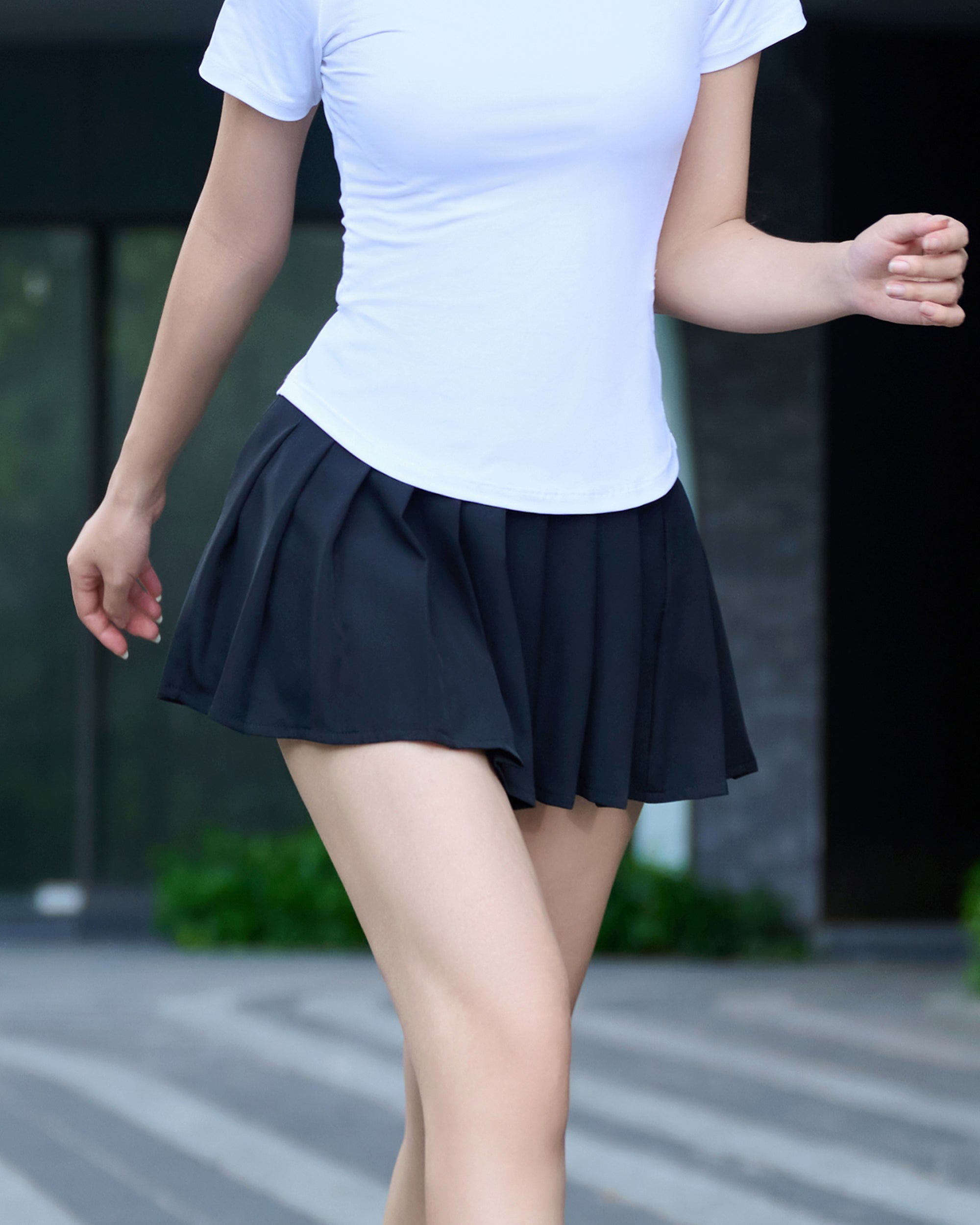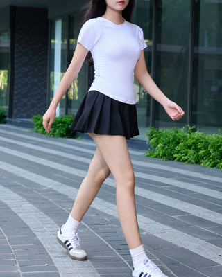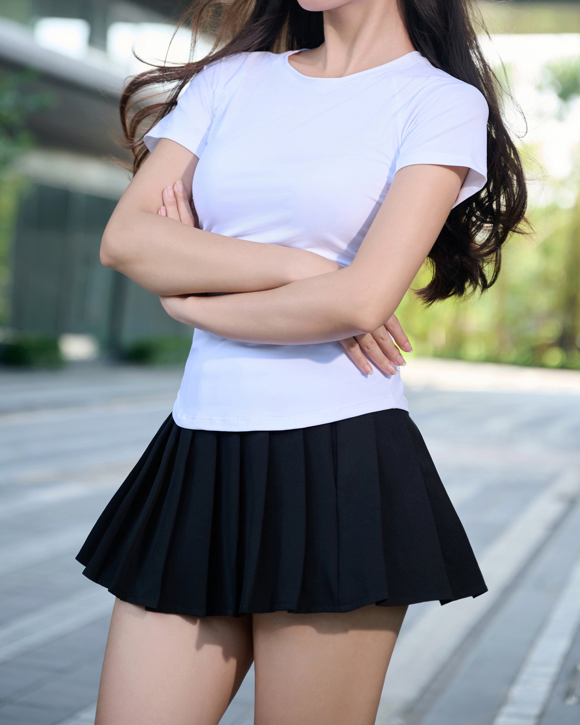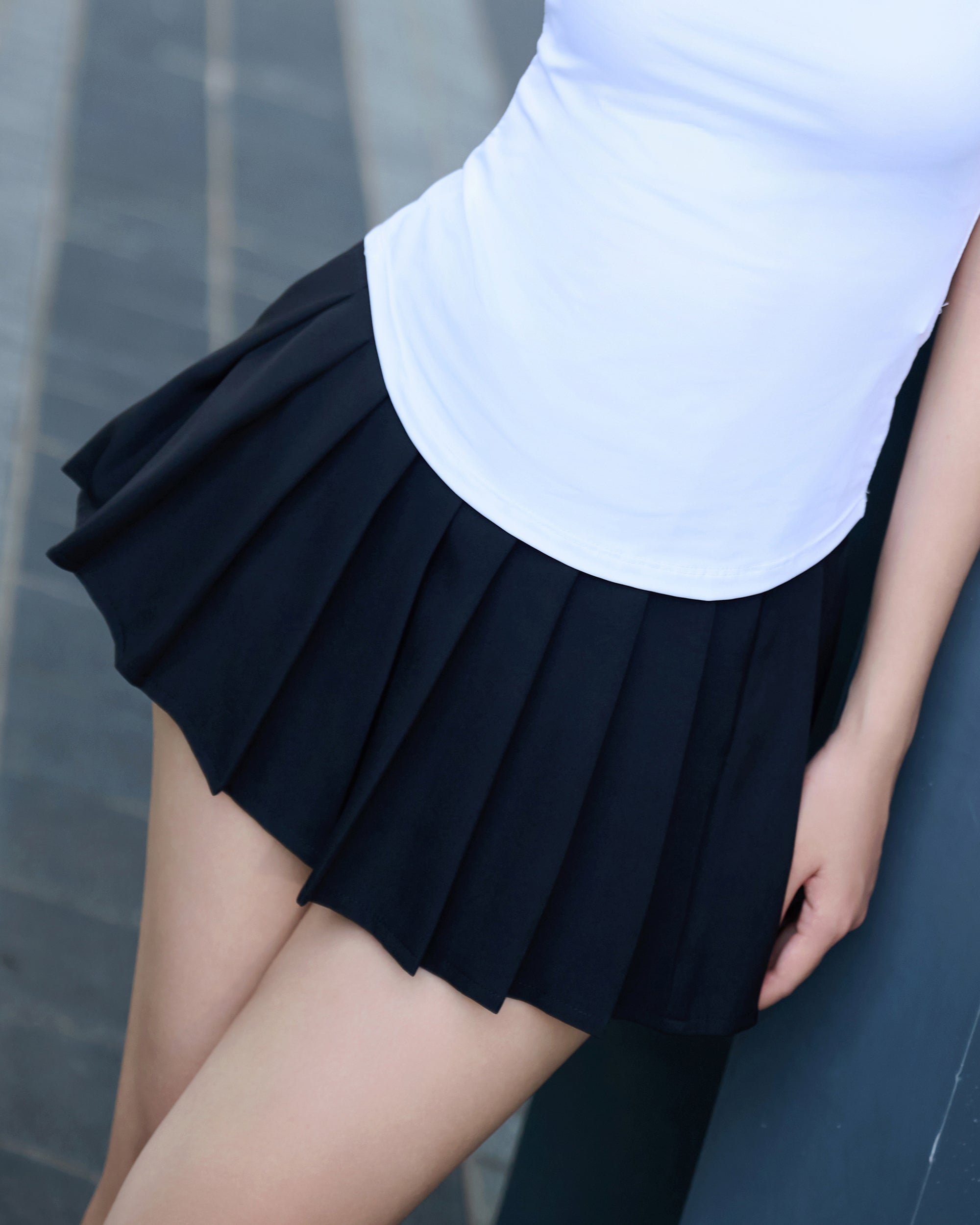 "Đa năng" là từ để mô tả chân váy xếp ly này: Vải co giãn, hút ẩm tốt / Có 2 túi như túi quần (nhưng không phá đi sự chỉnh chu của các ly váy) / Có quần bảo hộ kín đáo / Lưng chun phía sau giúp nới thêm bụng, nhưng cạp váy phía trước phẳng để vẫn "ra chất" / Khóa kéo bên hông tiện lợi.
