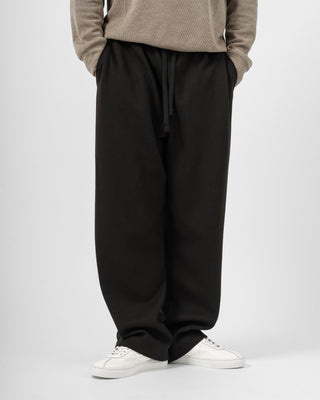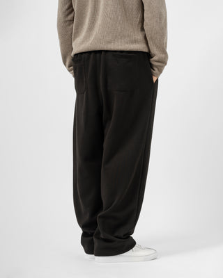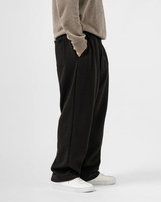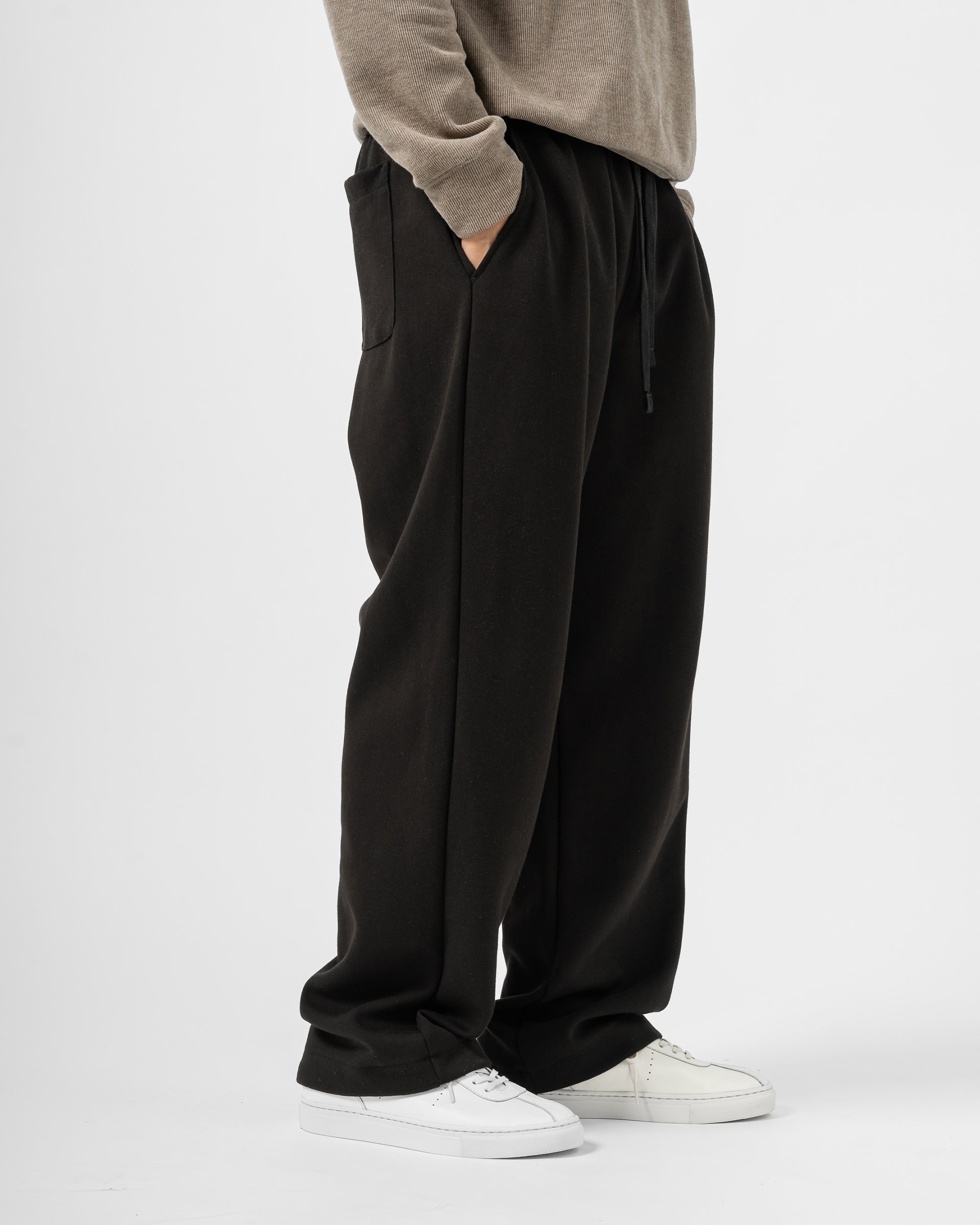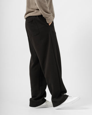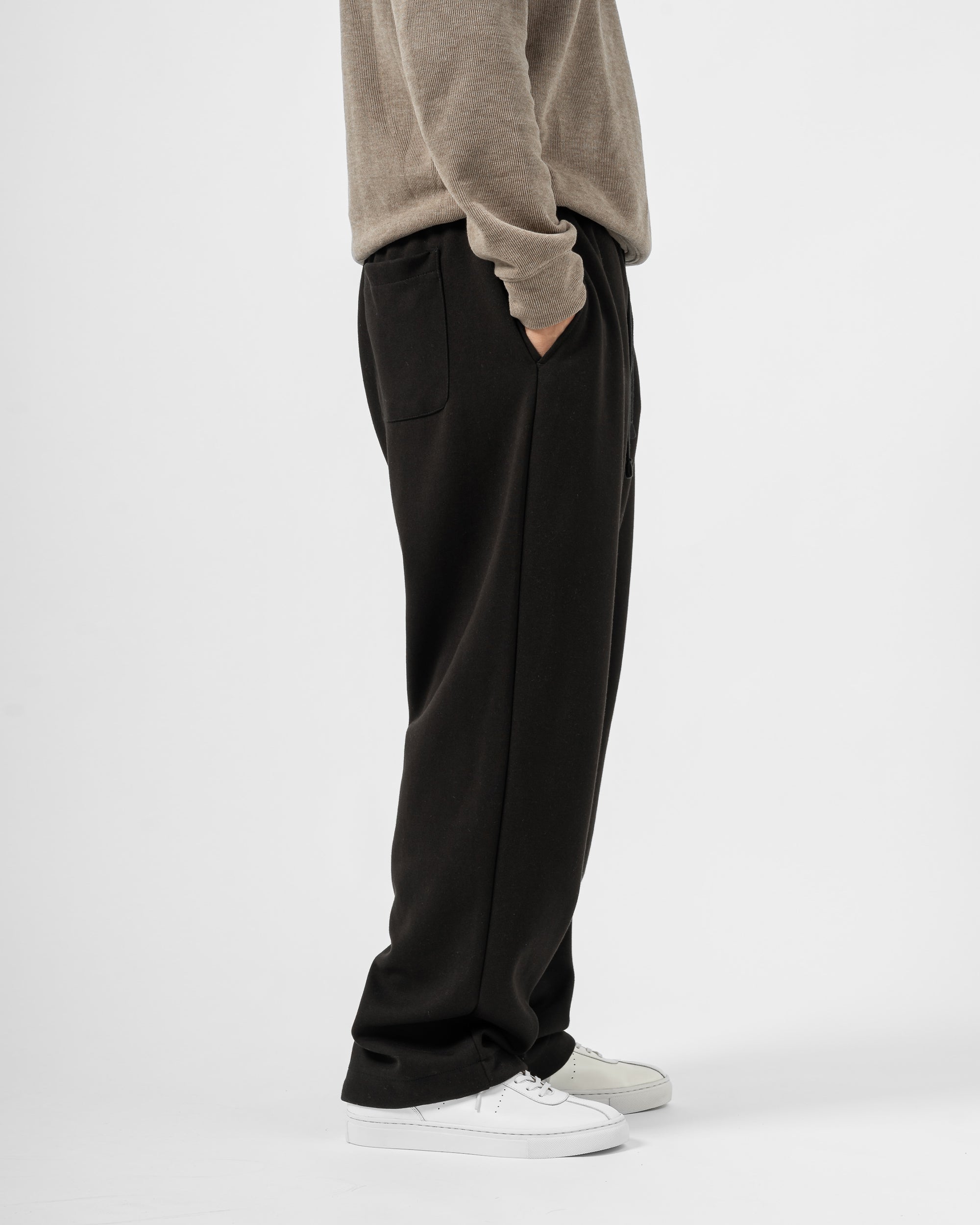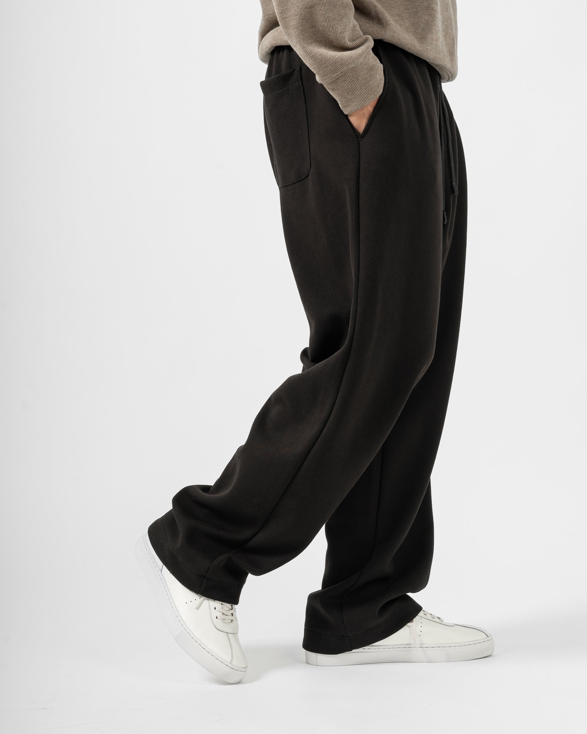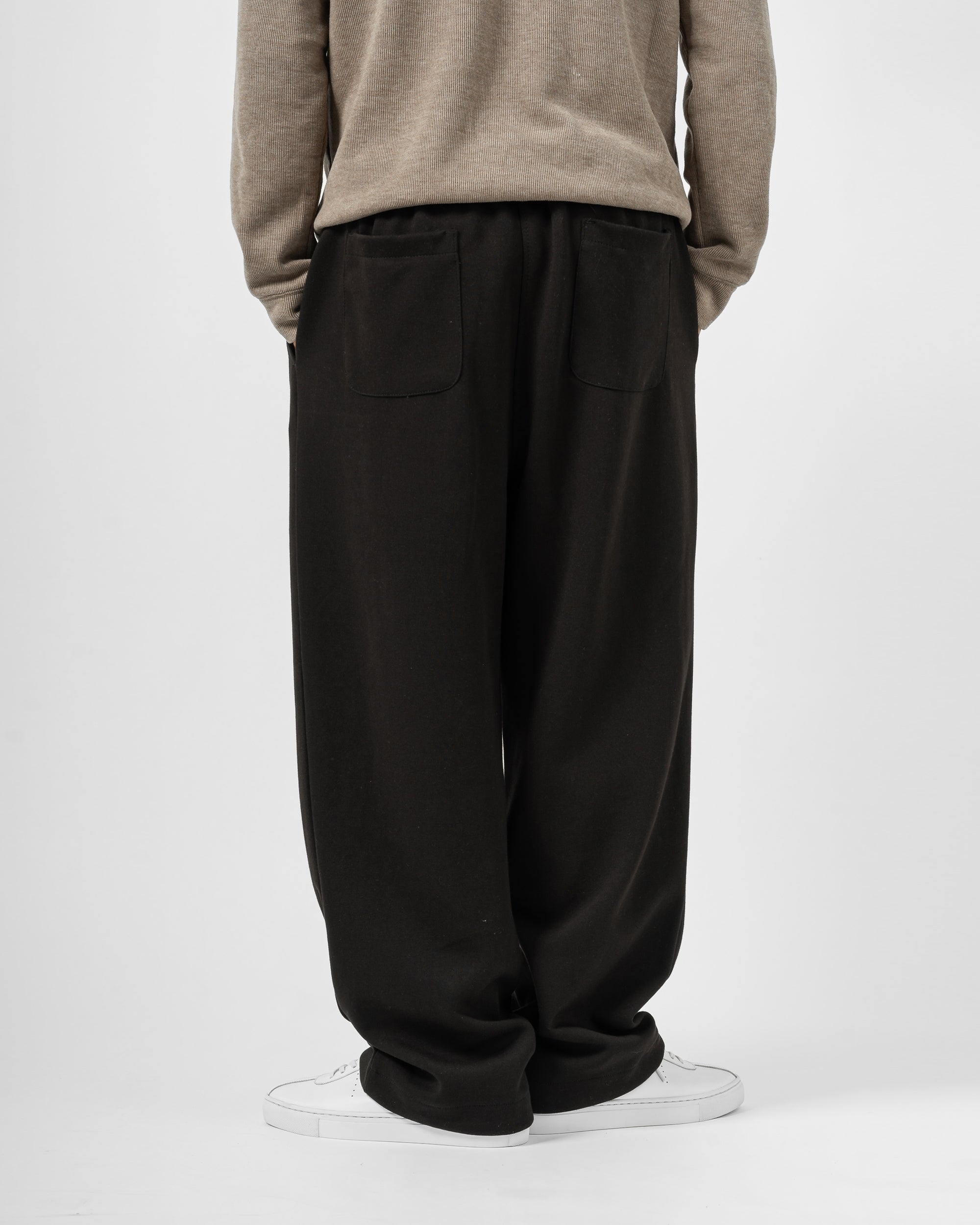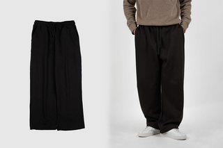Quần nỉ dáng rộng từ chất liệu nỉ hai mặt (nỉ BC) dày dặn với độ dày 300gsm, mặc được cả mùa thu đông lẫn mùa hè. Form dáng rộng rãi, năng động, kết hợp cạp chun và gấu quần có dây siết buộc được để trở thành một chiếc jogger khi cần thiết.