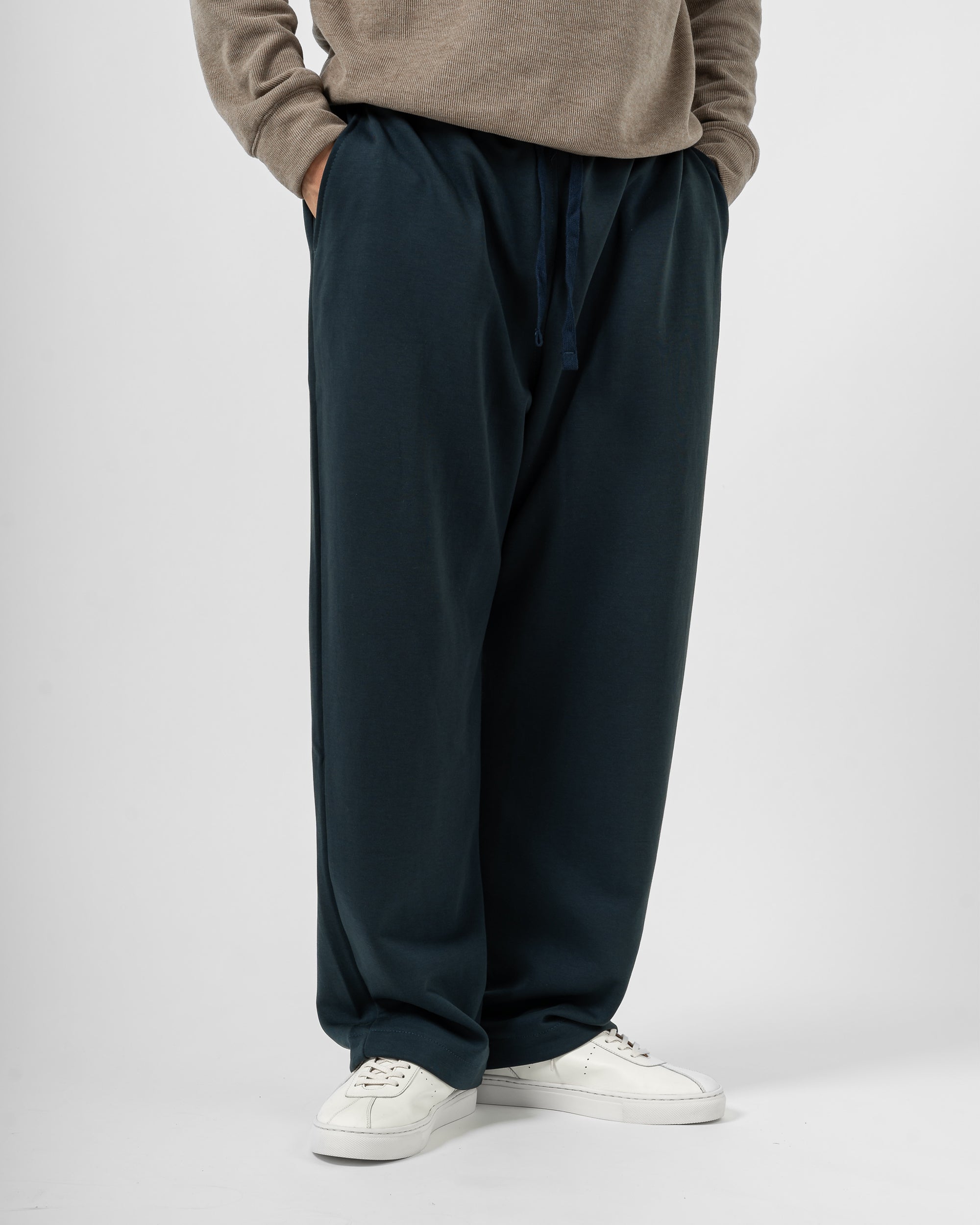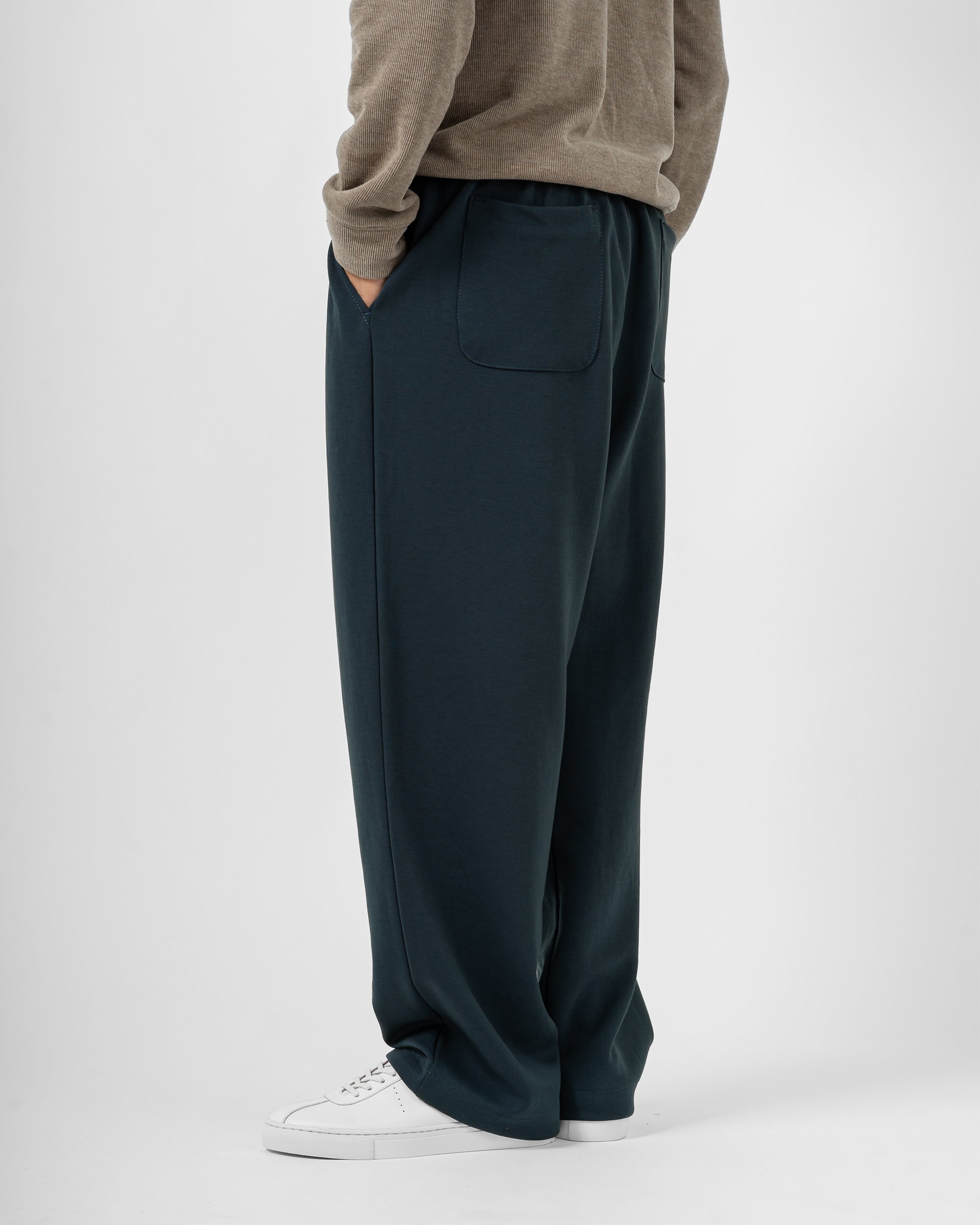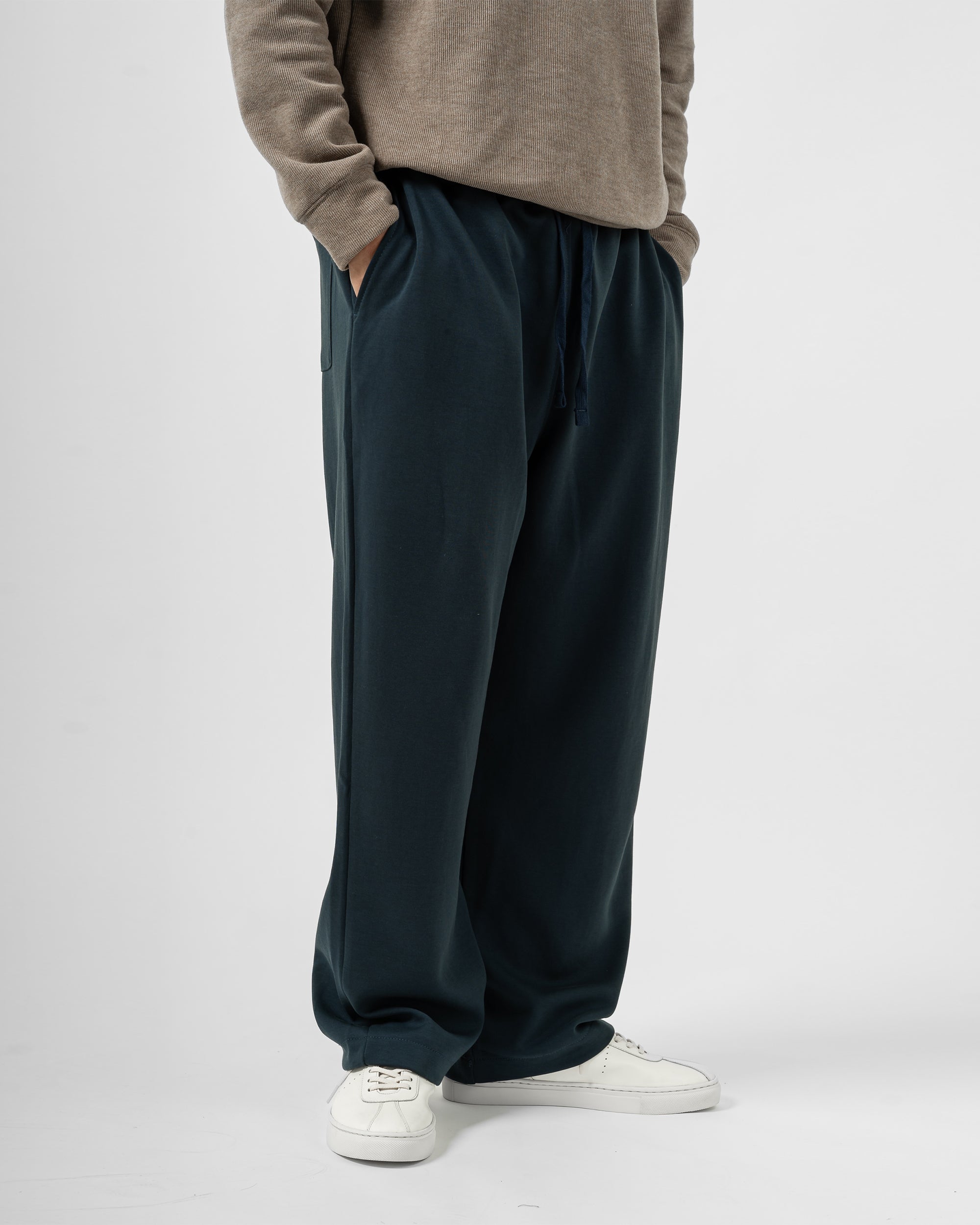 Quần nỉ dáng rộng từ chất liệu nỉ hai mặt (nỉ BC) dày dặn với độ dày 300gsm, mặc được cả mùa thu đông lẫn mùa hè. Form dáng rộng rãi, năng động, kết hợp cạp chun và gấu quần có dây siết buộc được để trở thành một chiếc jogger khi cần thiết.