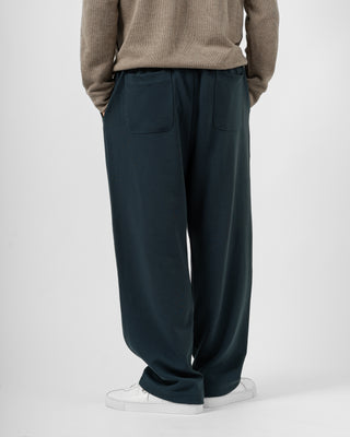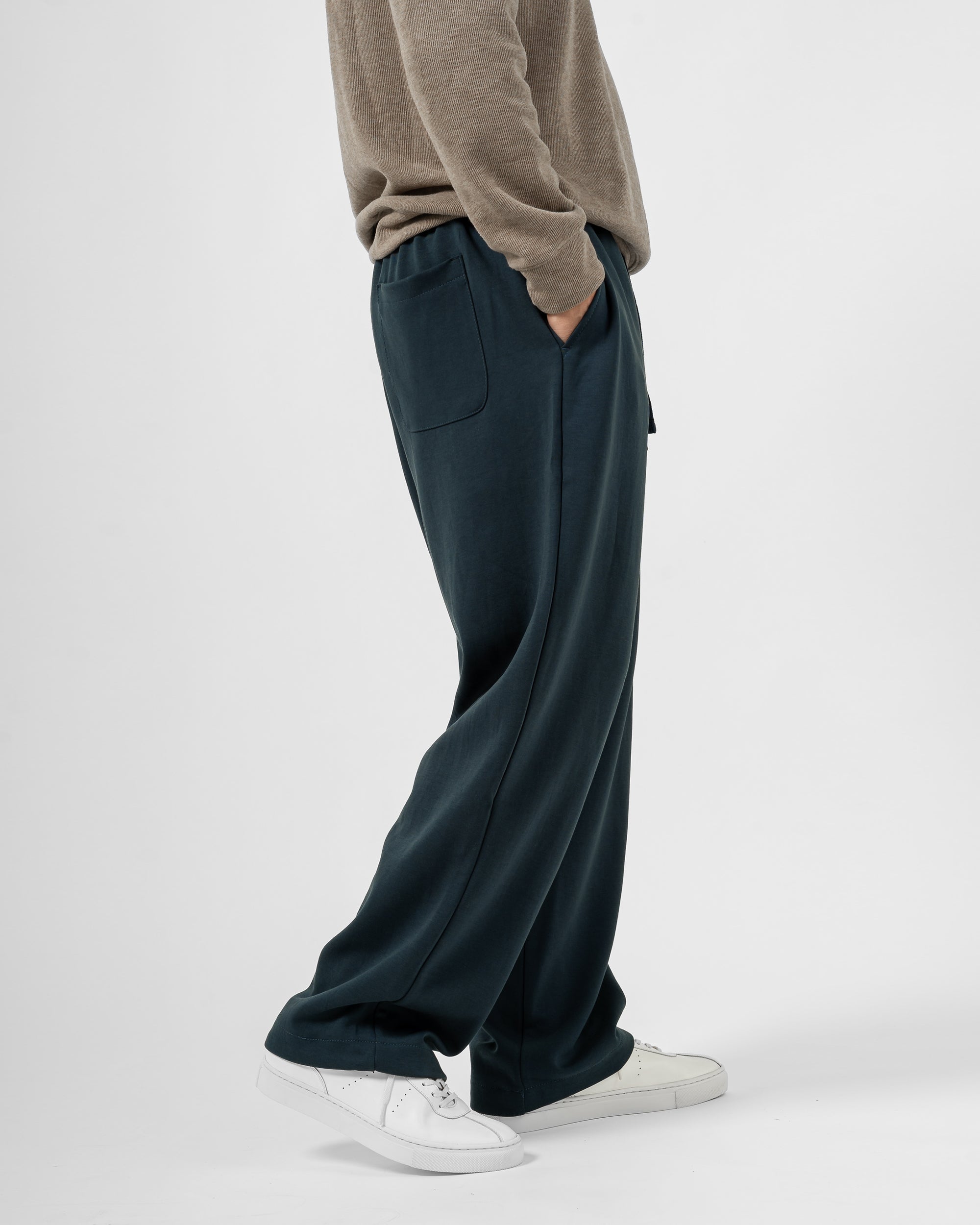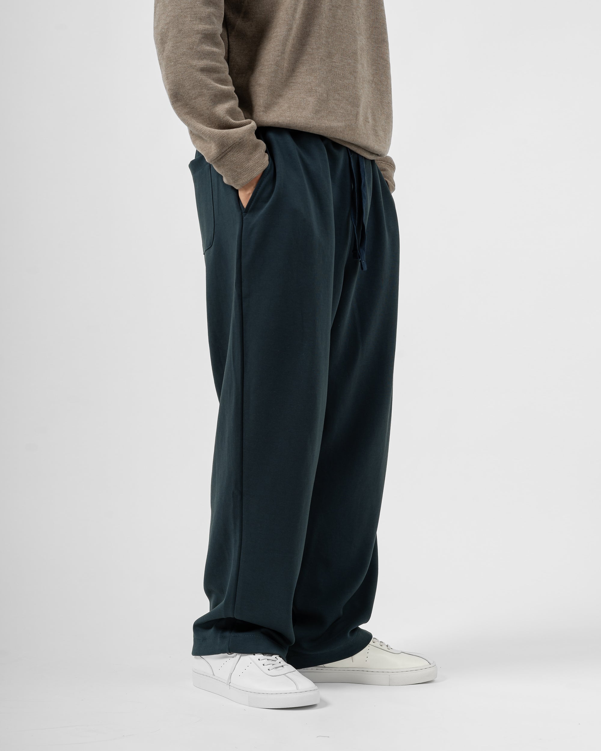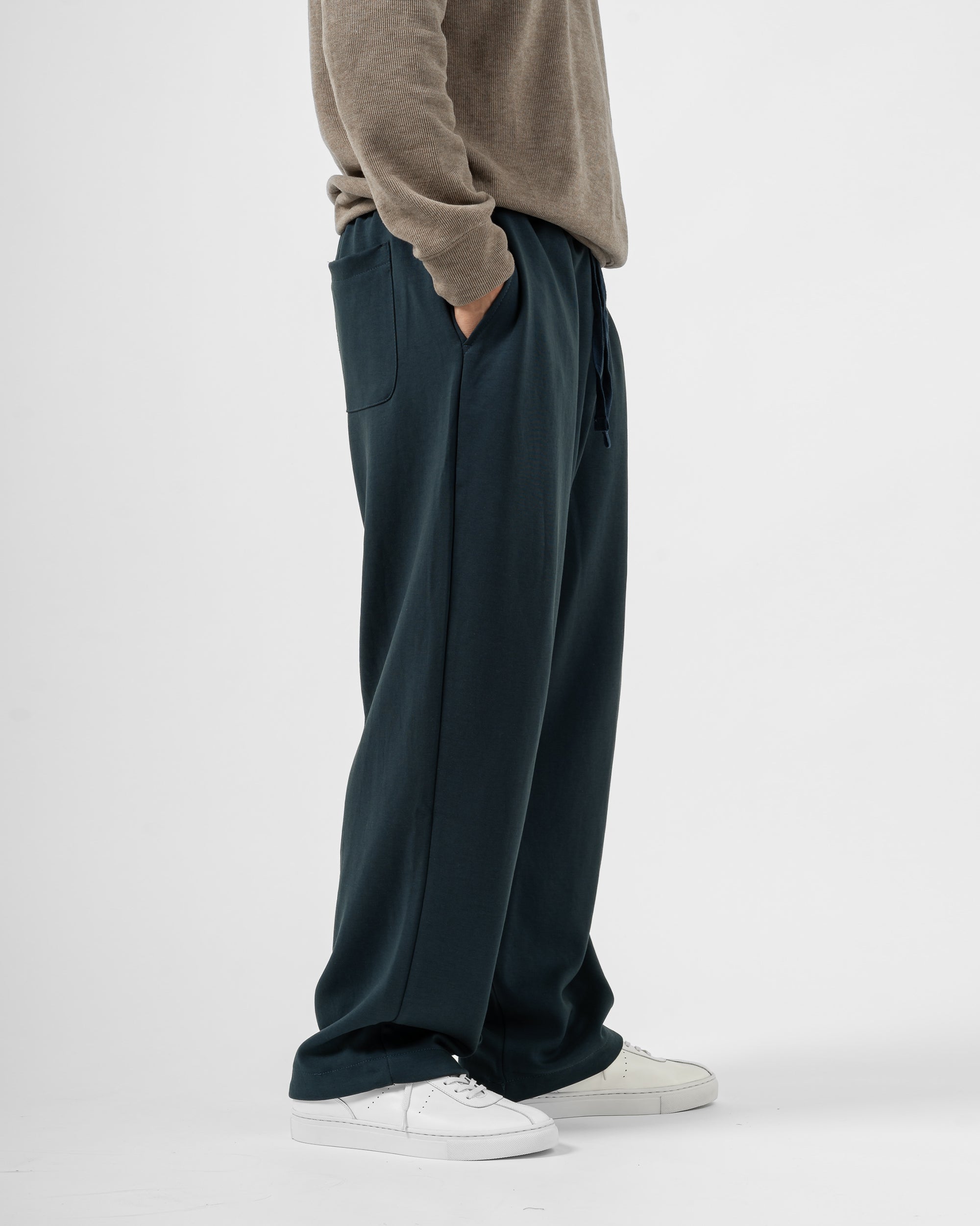Quần nỉ dáng rộng từ chất liệu nỉ hai mặt (nỉ BC) dày dặn với độ dày 300gsm, mặc được cả mùa thu đông lẫn mùa hè. Form dáng rộng rãi, năng động, kết hợp cạp chun và gấu quần có dây siết buộc được để trở thành một chiếc jogger khi cần thiết.